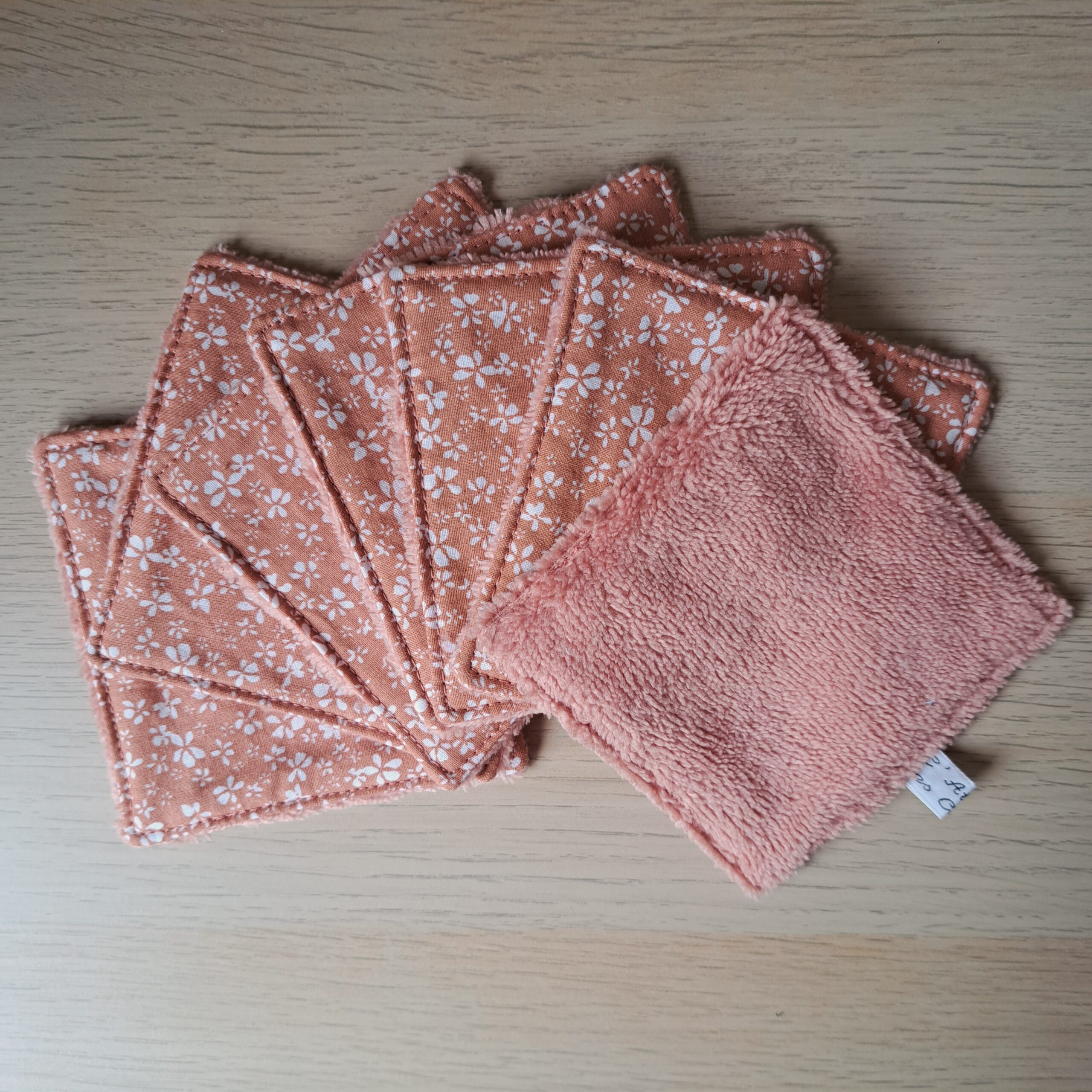 7 lingettes lavables motifs petites fleurs blanches sur fond corail
