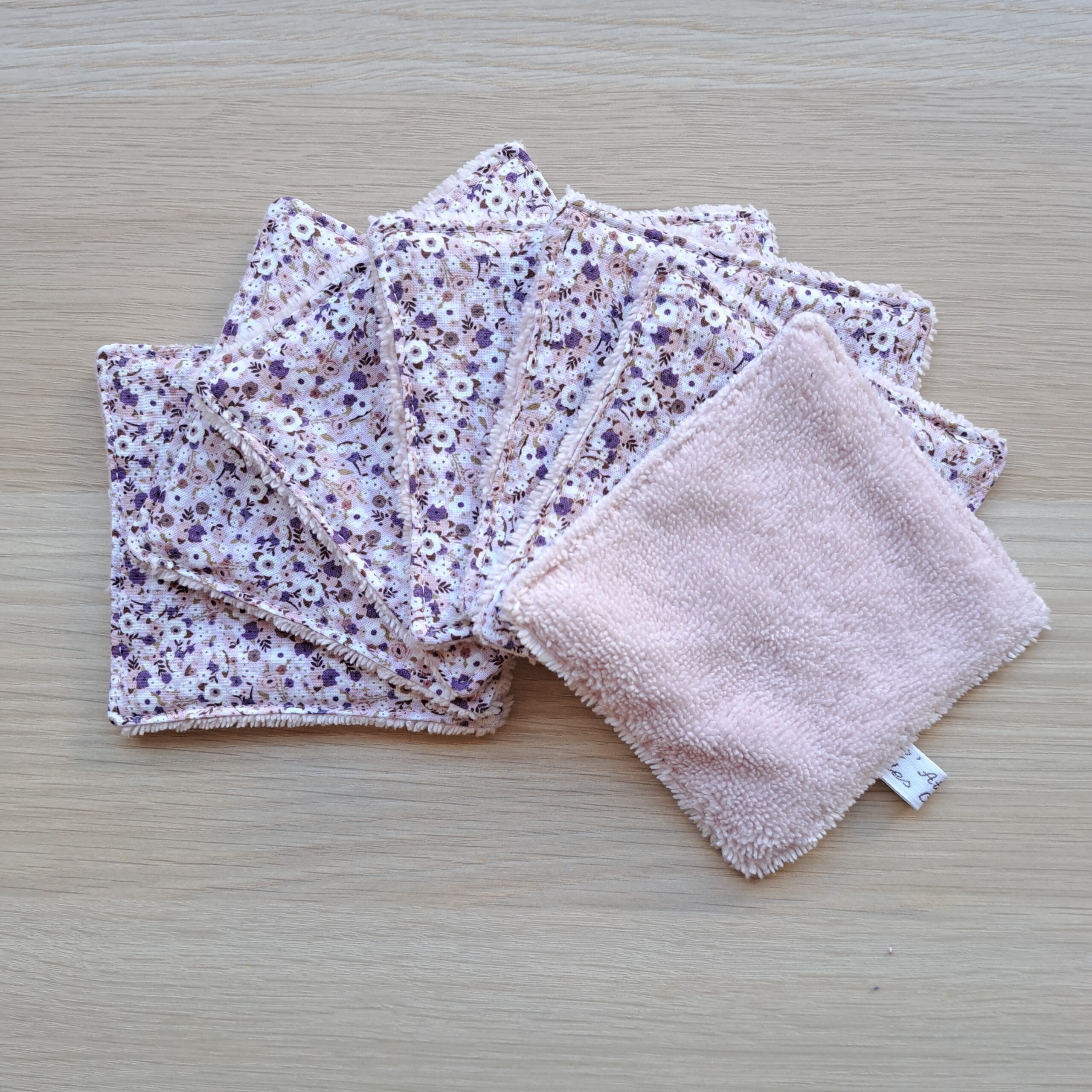 7 lingettes lavables petites fleurs blanches et violettes sur fond rose + panier de rangement assorti