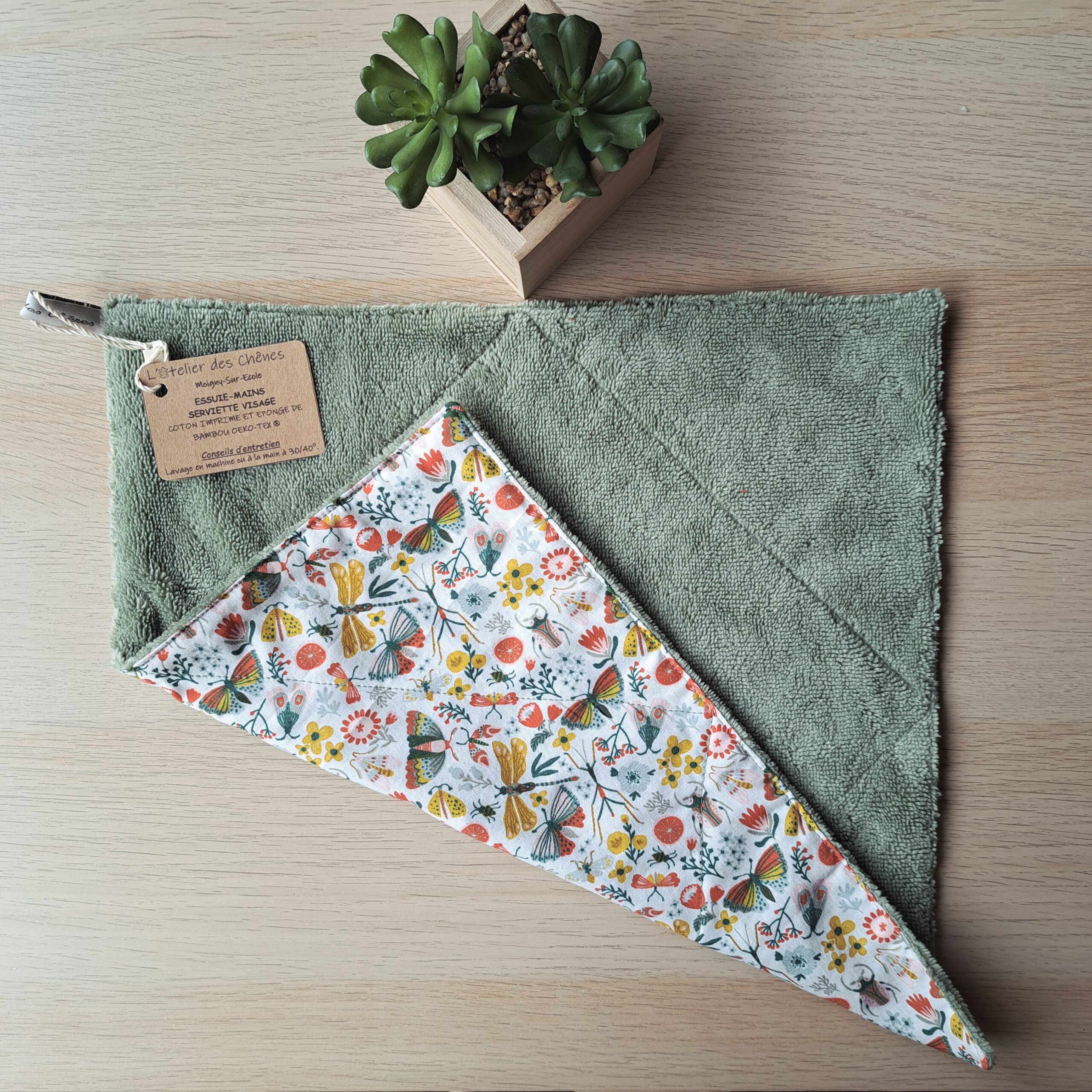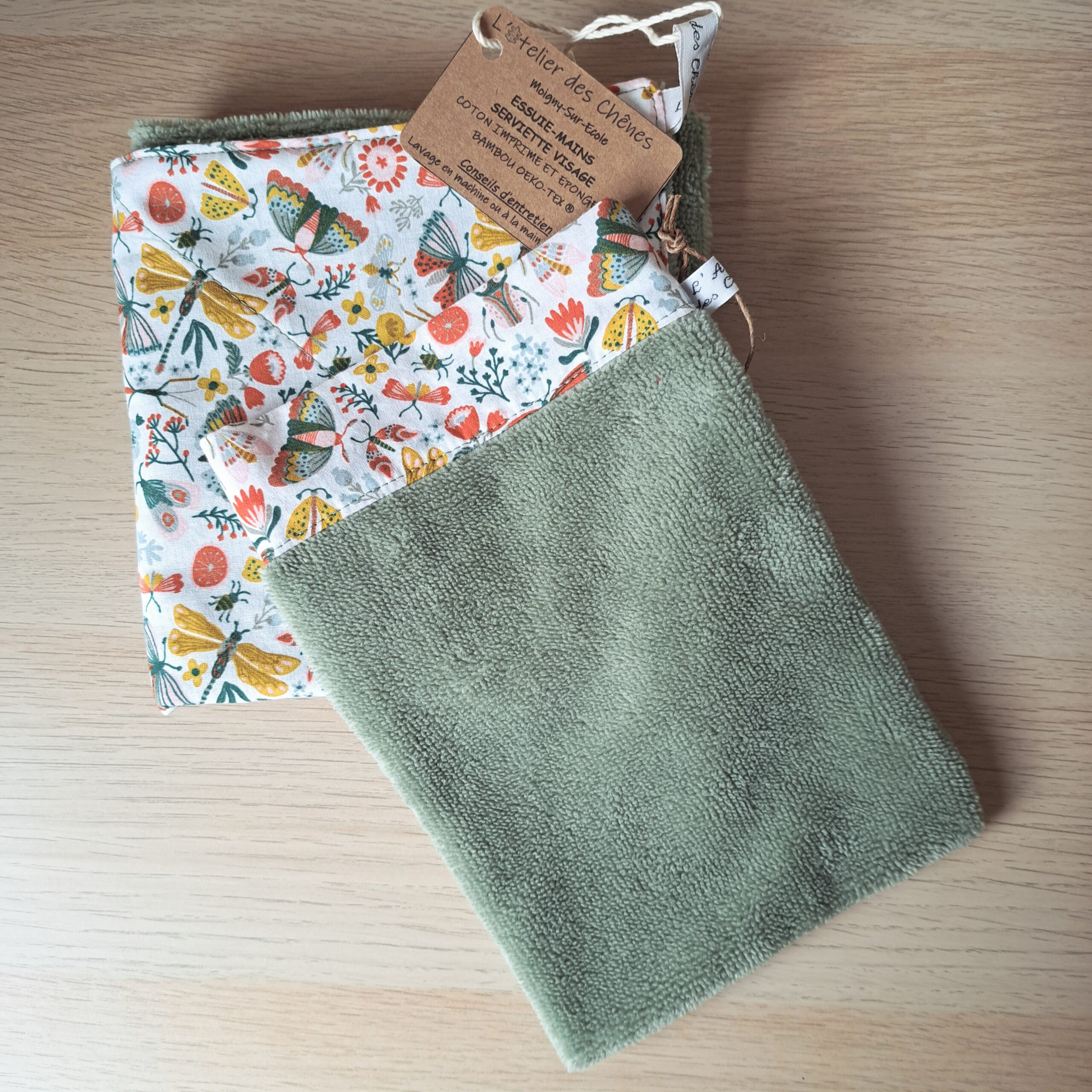 Essuie-mains / serviette visage coloris romarin et motifs papillons et insectes sur fond blanc