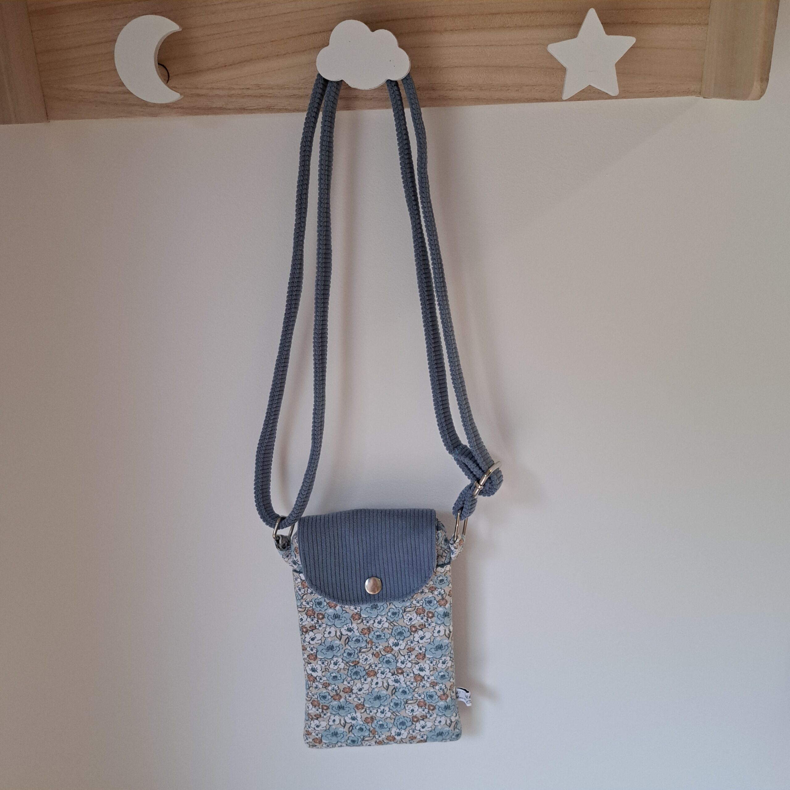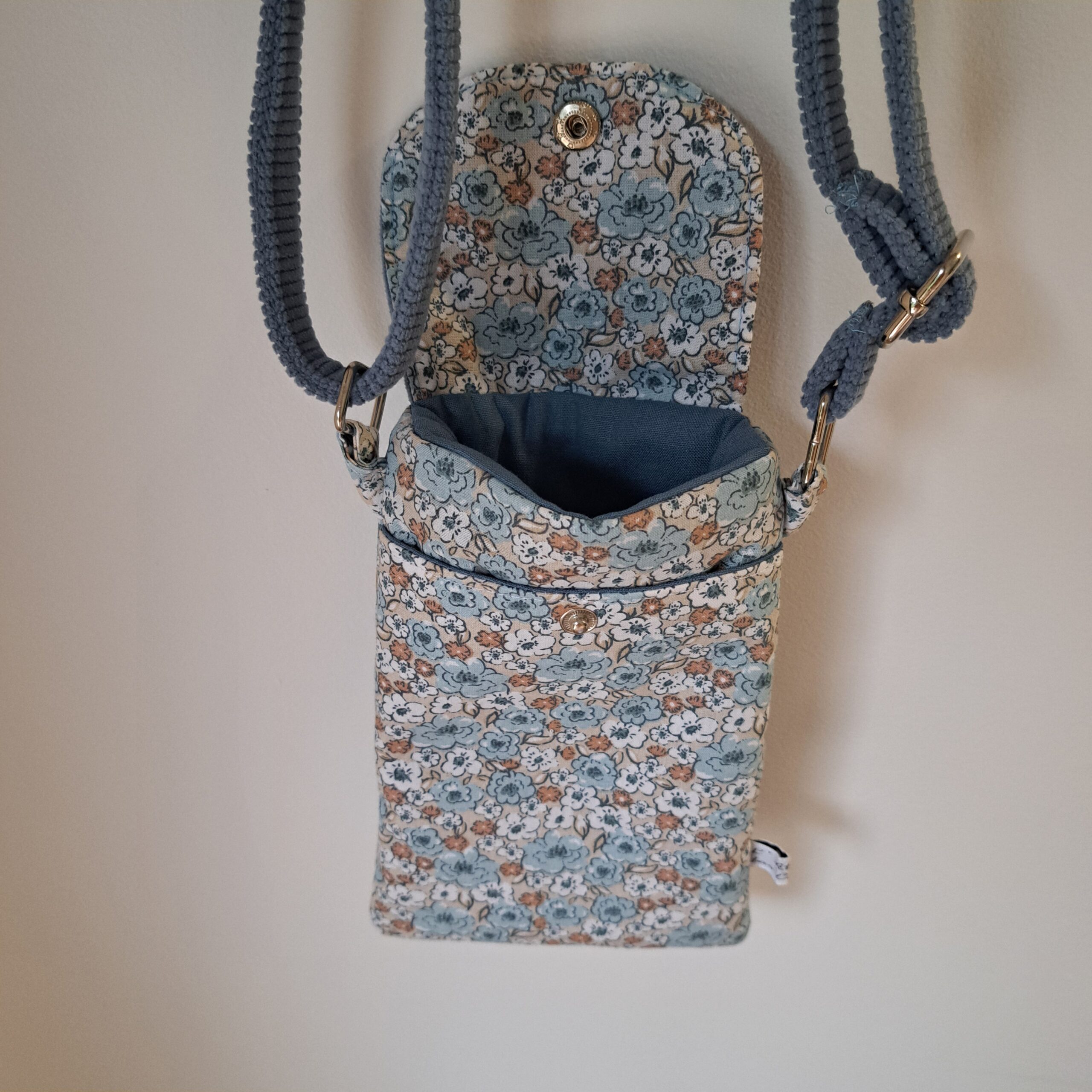 Pochette à bandoulière pour téléphone portable fleurs bleues et marron sur fond beige et velours bleu horizon