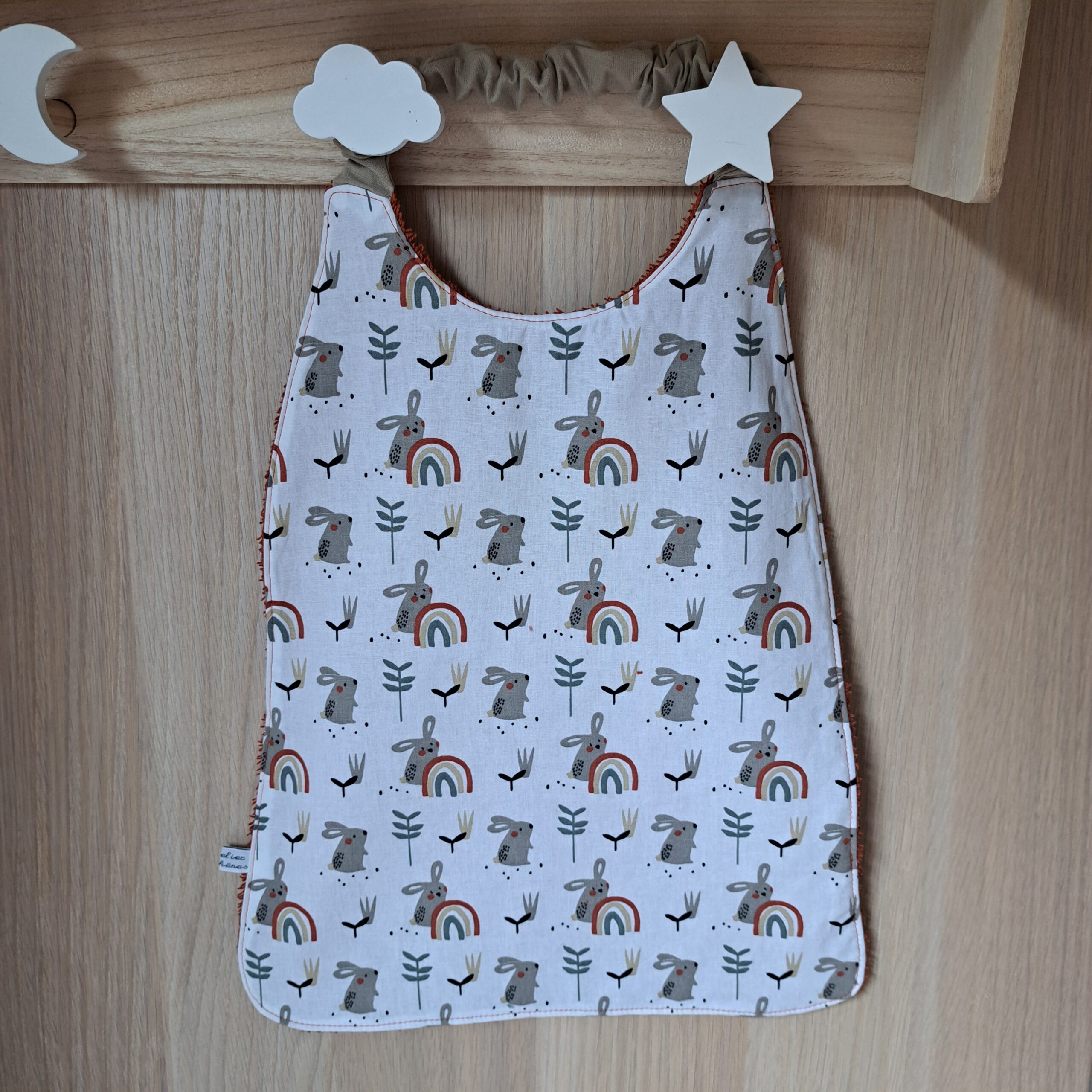 Serviette de cantine / grand bavoir tour de cou élastiqué motif lapins et arc en ciel